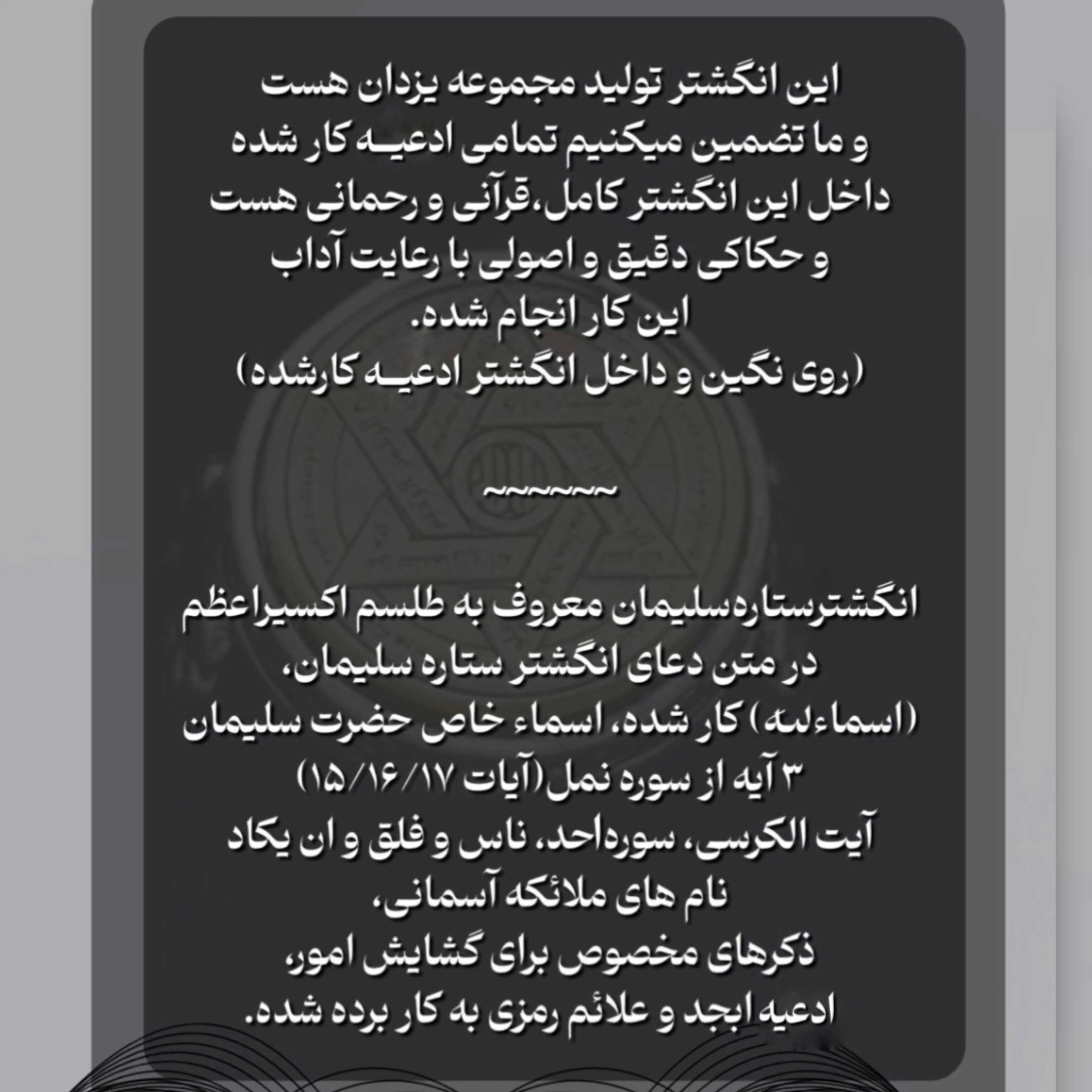 این انگشتر تولید مجموعه یزدان میباشد و ما تضمین میکنیم که تمامی ادعیه کار شده داخل این انگشتر کامل و رحمانی است و حکاکی دقیق و اصولی با رعایت تمام آداب و اصول شرعی این کار انجام شده و فاکتور اصالت هم همراه کالا خدمتتون ارسال میشه
