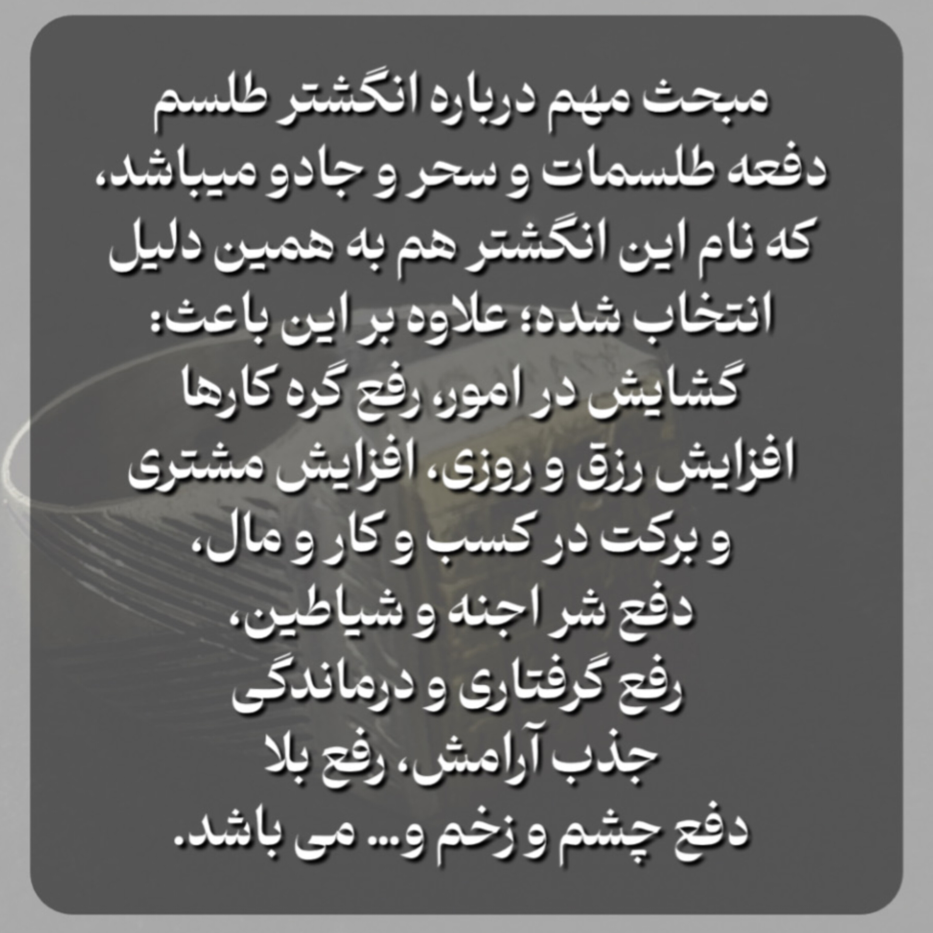 این انگشتر تولید مجموعه یزدان میباشد و ما تضمین میکنیم که تمامی ادعیه کار شده داخل این انگشتر کامل و رحمانی است و حکاکی دقیق و اصولی با رعایت تمام آداب و اصول شرعی این کار انجام شده و فاکتور اصالت هم همراه انگشتر ارسال میشه خدمتتون